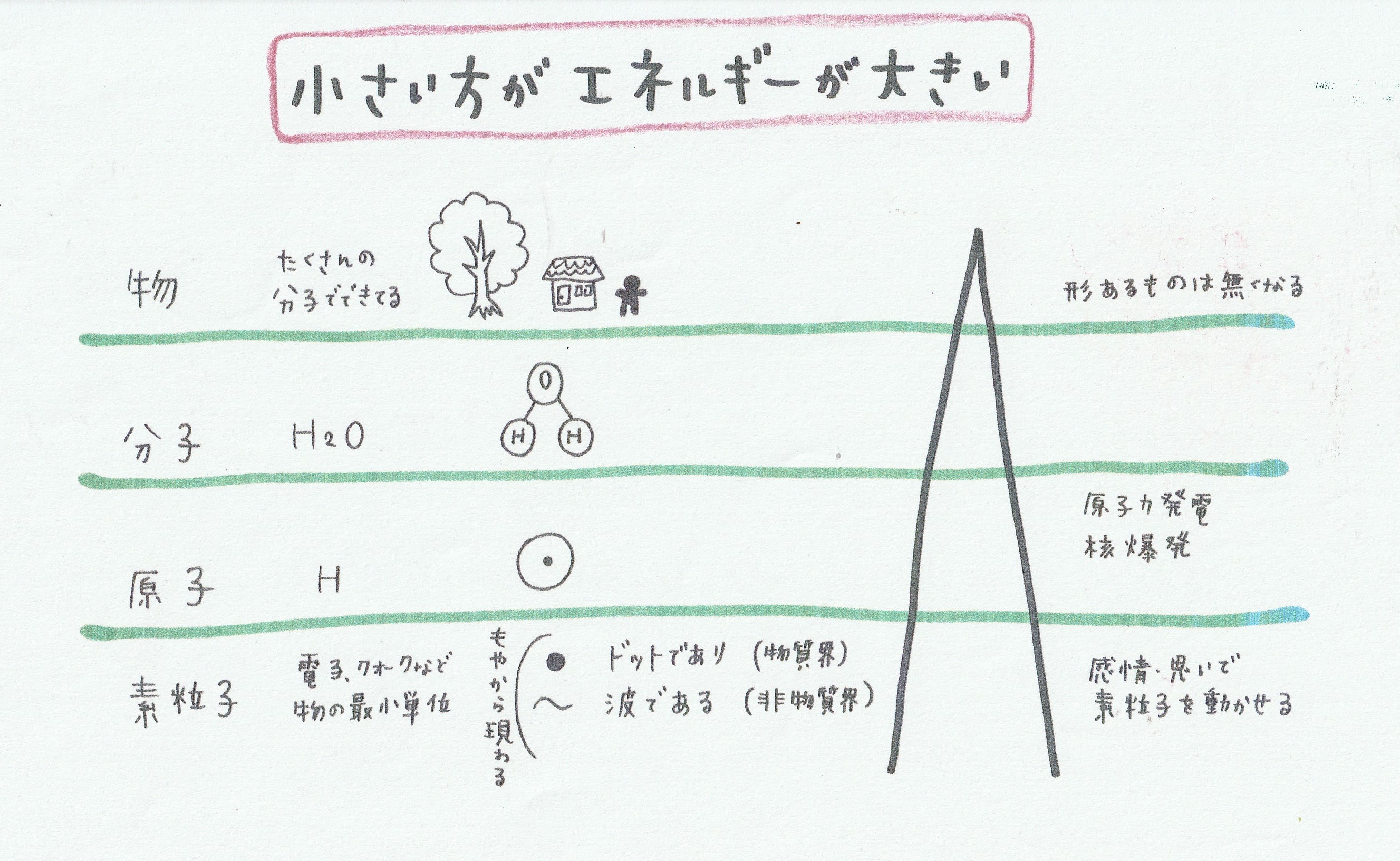 例えば、原子力発電所のエネルギーは凄いですよね。原子力発電所が壊れて、細かな物が拡散したとき、大きな被害が有りました。人の人体や生命にも影響がありました。また核爆弾などもすさまじい威力ですね。小さいものほどエネルギーが発生するんですね。